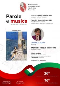 Si terrà venerdì 11 maggio alle ore 18.30 presso la sala Bonazzi del Conservatorio Nicola Sala di Benevento, nell’ambito della rassegna “Parole & musica”, ideata e curata da Luca Signorini, la presentazione del libro “Morfisa o l’acqua che dorme” di Antonella Cilento. Ne parlerà con l’autrice Stefano Manferlotti, docente di Letteratura inglese presso l’Università Federico II di Napoli. Modera la giornalista Elide Apice. Le musiche sono a cura di Luca Signorini, musicista, compositore e scrittore.