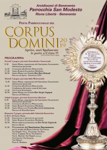 In occasione della solennità del Corpus Domini si porta in processione, racchiusa in un ostensorio sottostante un baldacchino, un’ostia consacrata ed esposta alla pubblica adorazione: viene adorato Gesù vivo e vero, presente nel Santissimo Sacramento. La Comunità di San Modesto di Benevento, dunque, aspetta tutti i credenti per vivere come comunità parrocchiale, rionale, cittadina, questo momento di fede di lode. Ci saranno Sacerdoti parroci di comunità della nostra diocesi che ci aiuteranno a conoscere sempre meglio il grande dono dell’Eucaristia nei giorni del Triduo 6-7-8 giugno alle ore 18:30 e domenica 9 alla Processione del SS. Sacramento che inizierà alle ore 19:30, dopo la Solenne Celebrazione Eucaristica delle 18:30.