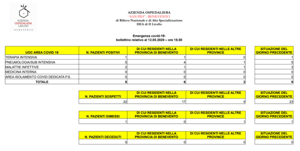 Si comunica che l’A.O.R.N. “San Pio” ha processato in data odierna nr. 100 tamponi, dei quali nr. 8 sono risultati positivi. Gli otto positivi non rappresentano nuovi casi, ma si riferiscono a conferme di positività già precedentemente accertata.