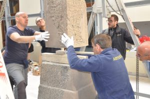 I lavori di riassemblaggio hanno richiesto molto tempo non solo per la delicatezza dell’operazione e la cura, l’attenzione e le accortezze dovute per la salvaguardia del bene archeologico, ma anche per studiare e dare attuazione al movimento “ad incastro” delle macchine elevatrici, dei ponteggi mobili e delle scale con le quali i cinque pezzi dell’importante reperto sono stati calati dall’alto, uno ad uno.