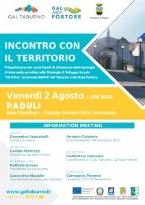 Venerdì 2 Agosto 2019, alle ore 18:30, presso la sala consiliare del Comune di Paduli sita nel Palazzo Ducale, si terrà il secondo incontro di presentazione della Strategia di Sviluppo Locale “T.E.R.RA.” dell’ATI Gal Taburno – Gal Area Fortore. Le prospettive concrete di sviluppo per i territori interessati e precisamente per il taburno, le colline beneventane ed il fortore, saranno al centro dell’iniziativa che vedrà la partecipazione di associazioni di categoria, sindaci, tecnici ed aziende agricole.