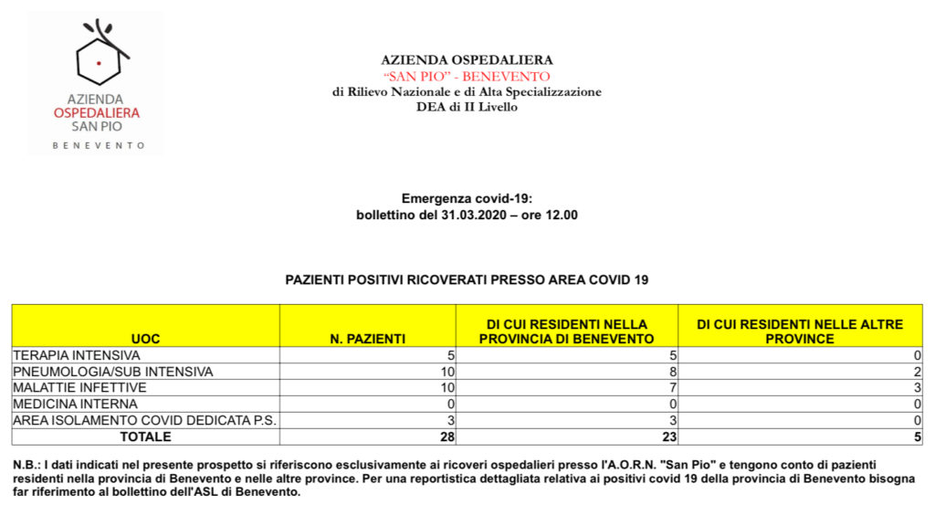 Ospedale San Pio di Benevento, bollettino informativo delle ore 12:00