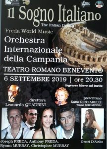Venerdì 6 settembre 2019 alle ore 20,30 al Teatro Romano di Benevento andrà in scena l’evento “Il sogno italiano – The italian dream” con l’Orchestra internazionale della Campania diretta da Leonardo Quadrini e la partecipazione di Joseph Freda, Anthony Freda, Ryann Murray e Christopher Murray. Special guest Genei D’Alelio.