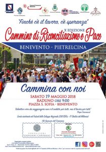 Sabato 19 maggio si terrà il X Cammino di Riconciliazione e Pace, “Finché c’è il lavoro, c’è speranza”, organizzato dalle Acli Provinciali di Benevento, dal Comune di Benevento, dal Comune di Pietrelcina, dalla Diocesi di Benevento, dal Convento dei Cappuccini di Pietrelcina, con il patrocinio della Regione Campania, della Provincia di Benevento e della Camera di Commercio di Benevento.